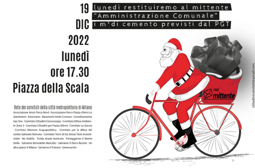 Lunedì 19 dicembre alle 17:30 in piazza della Scala, i comitati uniti nella Rete daranno vita a un flash mob per restituire all’Amministrazione comunale il cemento previsto sui loro territori, ben impacchettato in scatole che saranno consegnate a Palazzo Marino.…
