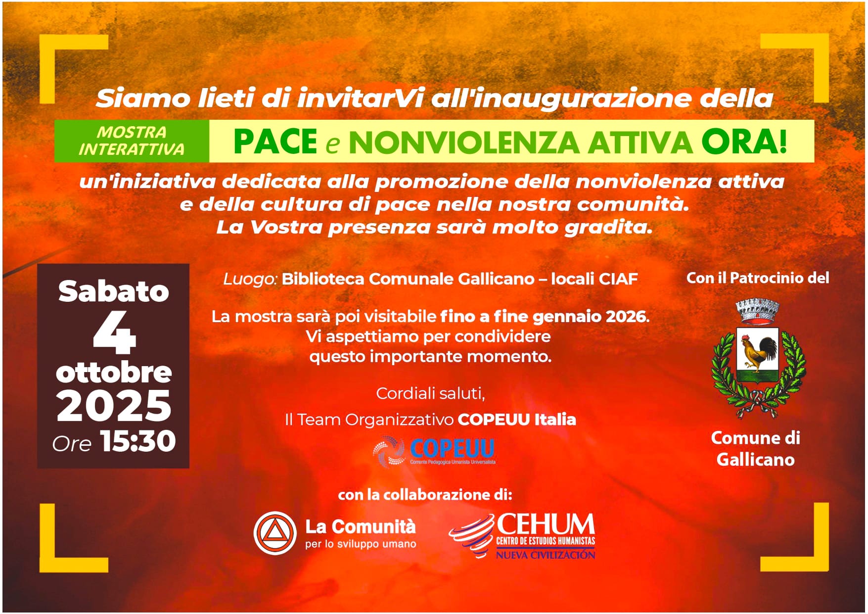 La comunità di Gallicano si prepara ad accogliere un’iniziativa di grande valore etico e sociale: la mostra interattiva “PACE E NONVIOLENZA ATTIVA ORA!”. Promossa congiuntamente dalla Corrente Pedagogica Umanista Universalista (COPEUU) e da La Comunità per lo Sviluppo Umano, e…