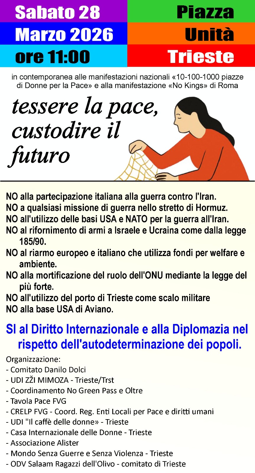 Sabato 28 marzo sarà una giornata di mobilitazione in tutta Italia contro la guerra. A Trieste è prevista una manifestazione in Piazza Unità dalle 11.00, in contemporanea all’iniziativa “10-100-1000” piazze di Donne per la Pace su numerosi territori nazionali e…