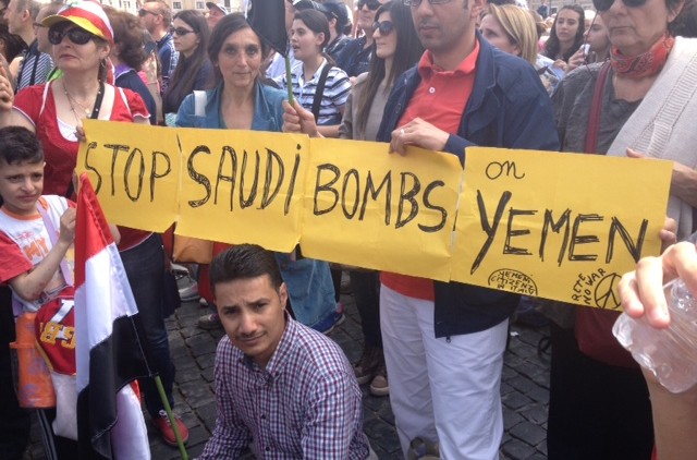 di Marinella Correggia Il 19 aprile 2015, a piazza San Pietro, cittadini yemeniti, di altri paesi arabi e italiani, in rappresentanza della Comunità yemenita, di Rete No War e di Assadaka hanno partecipato all’Angelus del Pontefice portando la bandiera nazionale…
