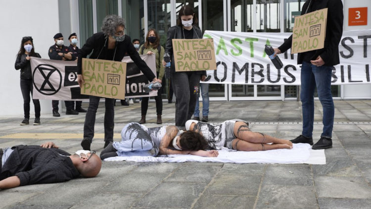 Azione di Extinction Rebellion Torino davanti alla sede di Intesa San Paolo