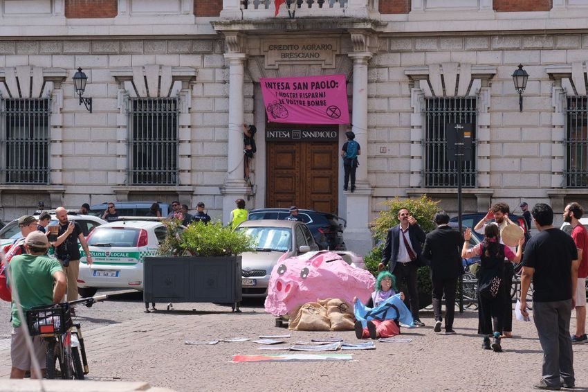 Brescia: Extinction Rebellion protesta con Intesa Sanpaolo per gli investimenti in armi