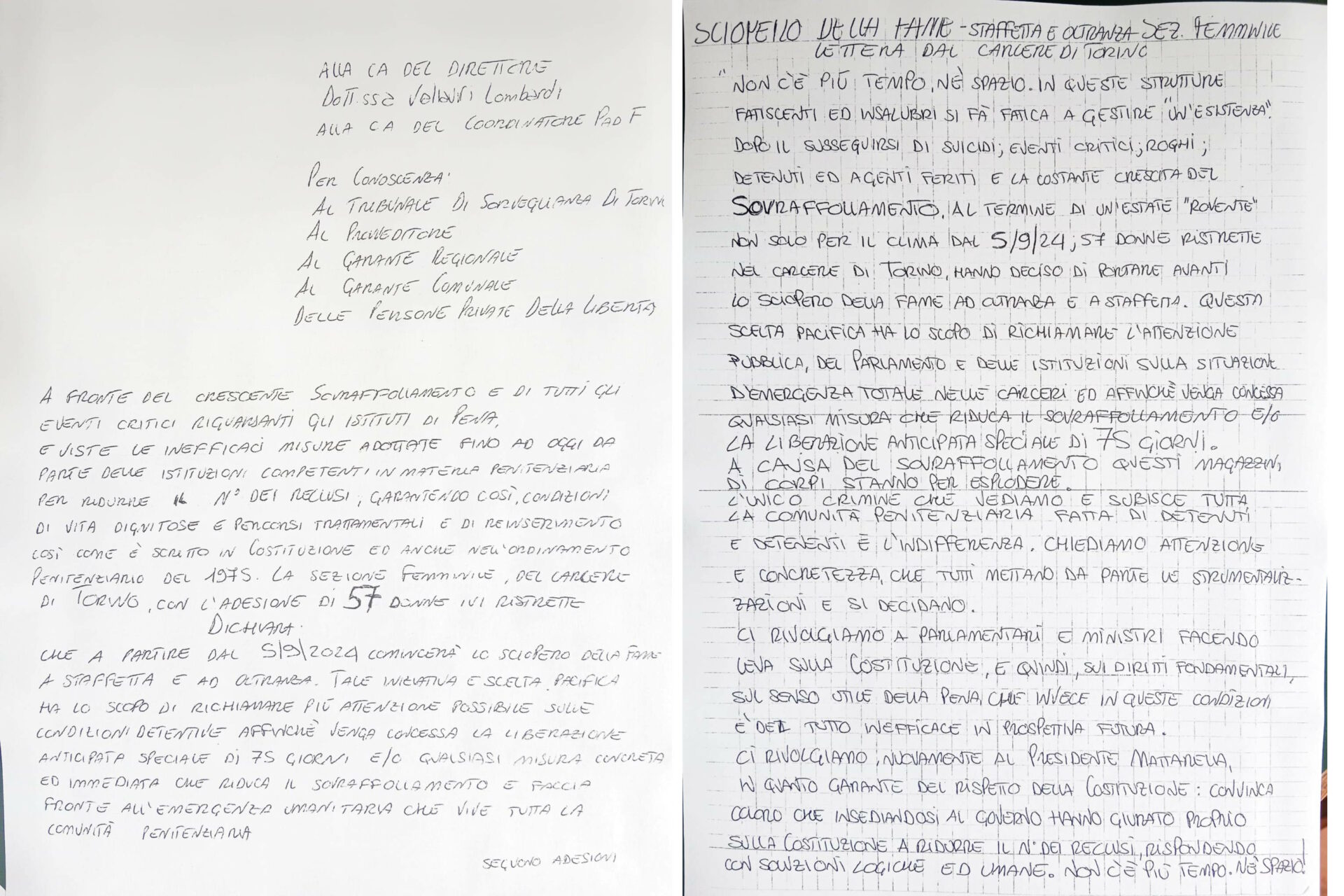 Sciopero della fame – staffetta a oltranza sezione femminile. Lettera dal carcere di Torino