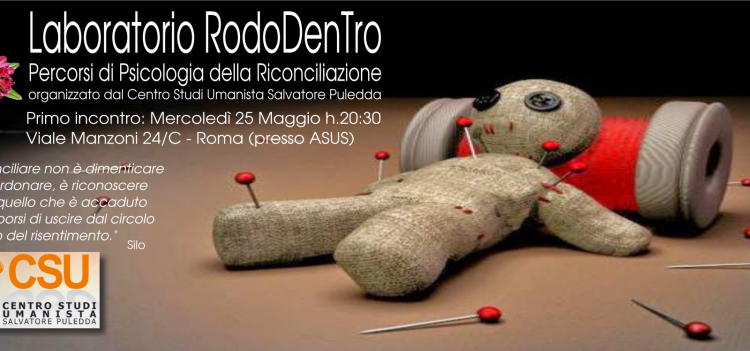 Il Centro Studi Umanista Salvatore Puledda di Roma è lieto di invitarti al “Laboratorio RodoDenTro. Percorsi di psicologia della riconciliazione”, che avrà inizio mercoledì 25 maggio 2016 presso la sede dell’Accademia di Scienze Umane e Sociali (ASUS) in viale Manzoni…