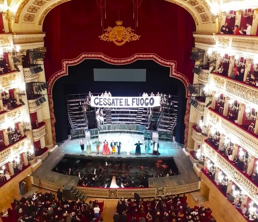 “Cessate il fuoco”: il chiaro messaggio che porta lo striscione esposto sul palco, al Teatro San Carlo di Napoli, in occasione dell’ultima rappresentazione, martedì 27 febbraio, del Don Giovanni di Mozart, con la regia di Mario Martone e la direzione…