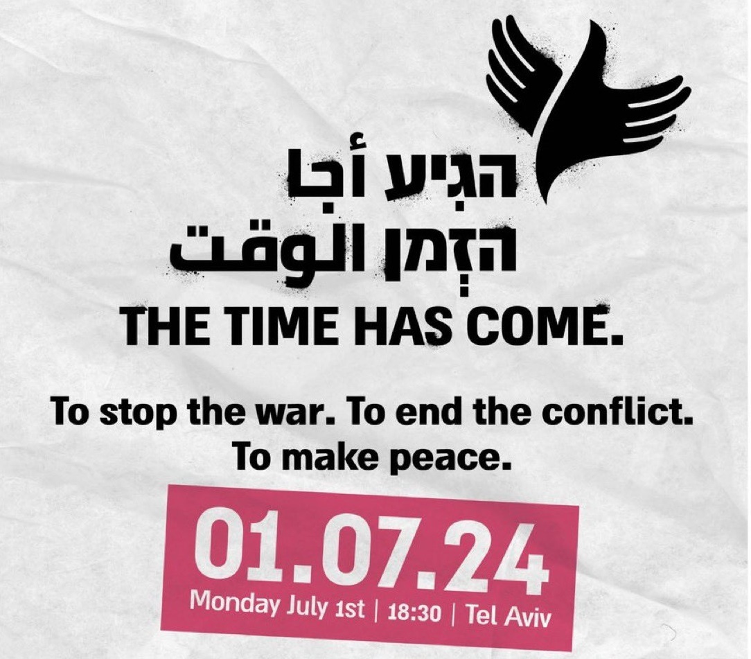 In sostegno alla manifestazione “THE TIME IS NOW” del 1° luglio 2024 a Tel Aviv Il 1° luglio a Tel Aviv si realizzerà una grande mobilitazione per dire no alla guerra, per la fine del conflitto e per un nuovo accordo di…