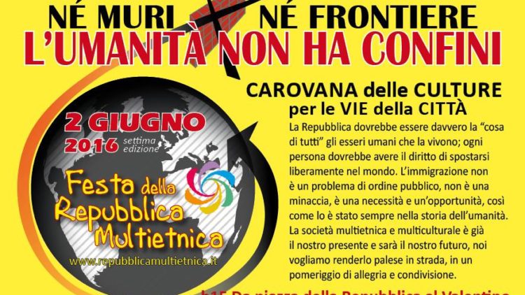 FESTA DELLA REPUBBLICA MULTIETNICA NÉ MURI NÉ FRONTIERE, L’UMANITÀ NON HA CONFINI   Giovedì 2 giugno si è svolta la settima edizione della Festa della Repubblica Multietnica organizzata da Convergenza delle Culture e Orizzonti in libertà: un corteo multiculturale, allegro,…