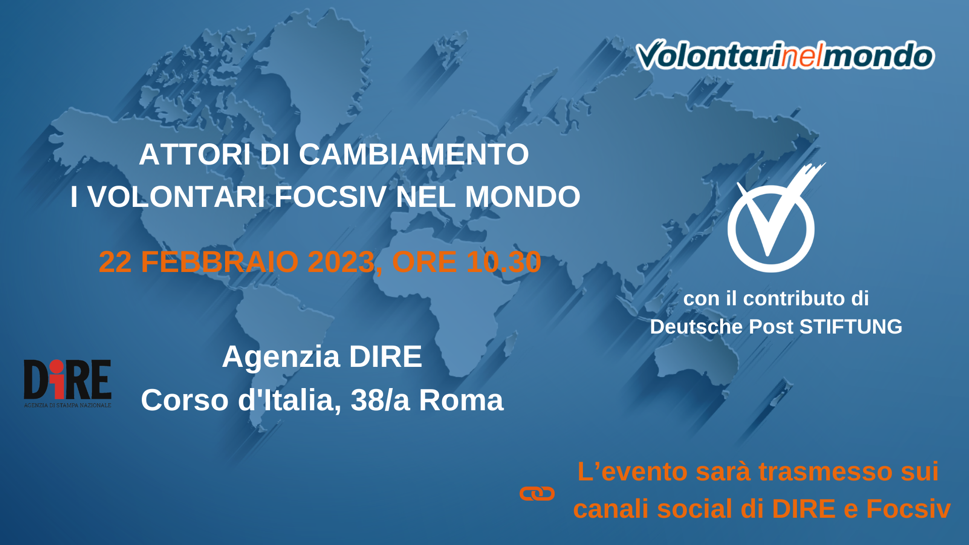 Attori di cambiamento, i volontari FOCSIV nel mondo  Mercoledì 22 febbraio 2023 dalle ore 10:30 alle 13:00 Roma, Agenzia DIRE, Corso d’Italia, 38/A Mercoledì 22 febbraio a Roma presso Agenzia DIRE, in Corso D’Italia 38/A, dalle ore 10:30 alle 13:00…