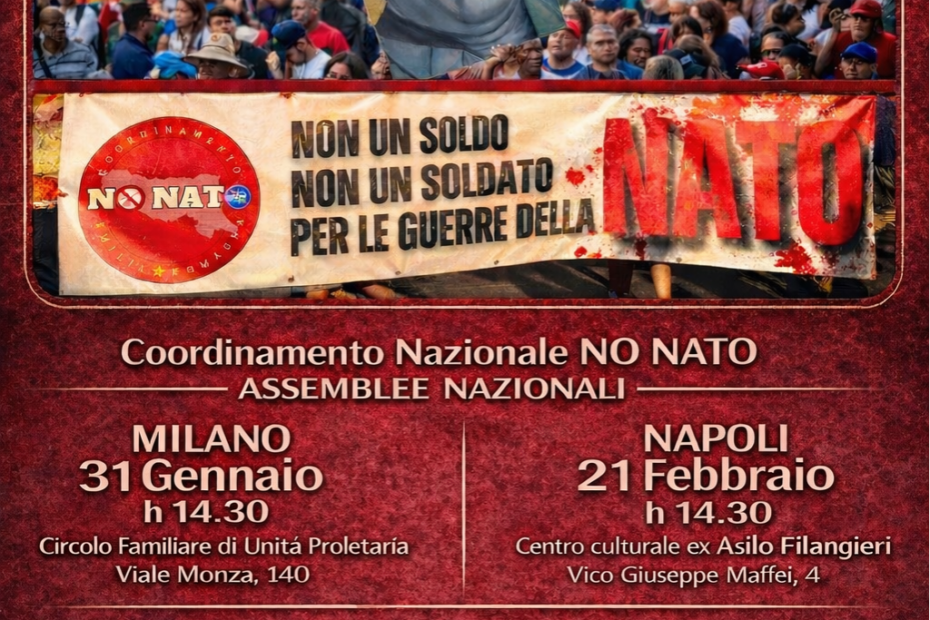Il Coordinamento Nazionale No NATO annuncia la convocazione dell’Assemblea Nazionale dedicata alle regioni del centro-sud, che si terrà il giorno 21 febbraio 2026 presso ex Asilo Filangieri Bene comune vico Giuseppe Maffei 4, Napoli. L’incontro rappresenta un momento fondamentale di…