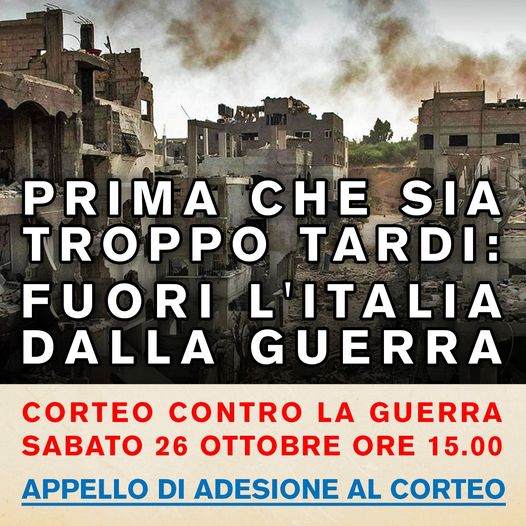 APPELLO DI ADESIONE AL CORTEO DEL 26 OTTOBRE 2024 A MILANOPRIMA CHE SIA TROPPO TARDI: FUORI L’ITALIA DALLA GUERRA Sabato 26 ottobre 2024 ore 15.00, corteo da Stazione Centrale a piazza San Babila