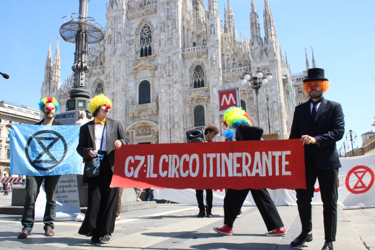 In Piazza Duomo a Milano un circo itinerante per contestare il G7 dei trasporti