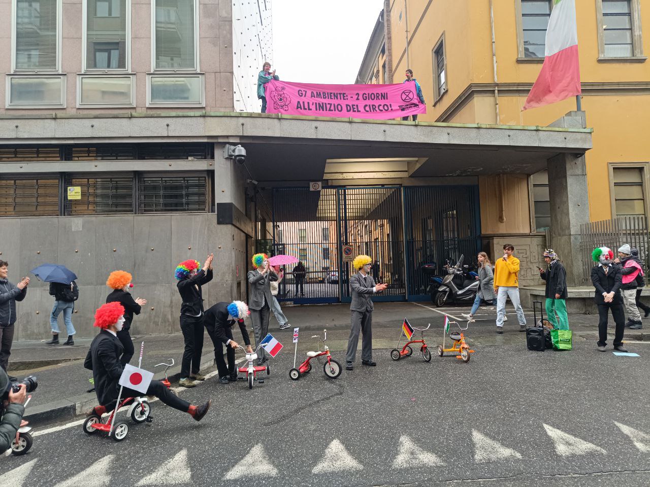 Attivisti di Extinction Rebellion vestiti da pagliacci in giacca e cravatta contestano l’appuntamento dei Ministri dei Trasporti al limite della zona rossa, mentre uno striscione recita “G7: il circo itinerante”. Questa mattina un gruppo di persone travestite da pagliacci in…