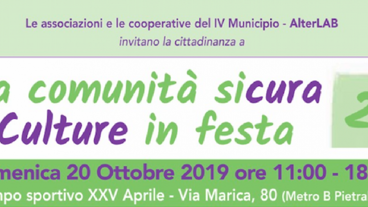 Le associazioni e le cooperative del IV Municipio – AlterLAB invitano la cittadinanza a La comunità sicura Culture in festa  2 edizione Educazione, arte e sport  per l’inclusione sociale e l’intercultura Domenica 20 Ottobre 11:00 – 18:30 Campo sportivo XXV Aprile Via…