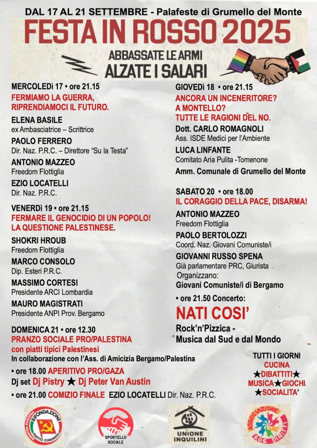 Il Palafeste di Grumello del Monte ospiterà per la prima volta, dal 17 al 21 settembre, la Festa in Rosso, organizzata dallo Sportello Sociale Val Calepio e da Rifondazione Comunista ValCalepio. La Festa in Rosso, per 36 anni – fin dai tempi…