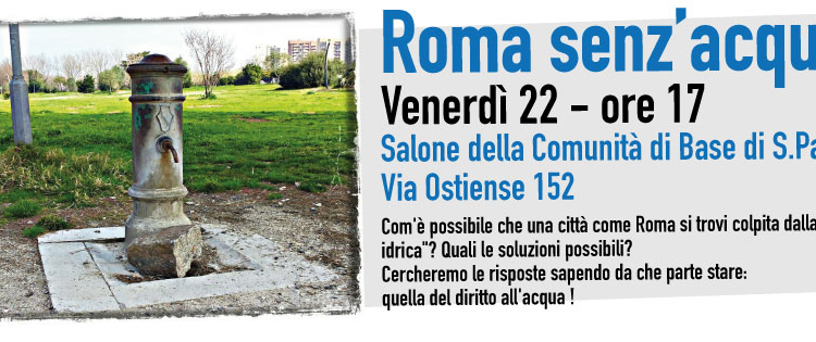 ROMA SENZ’ACQUA 22 settembre, alle ore 17.00  – Comunità di Base di S.Paolo, Via Ostiense 152/B (Metro Garbatella) La città degli acquedotti, delle fontane, dei nasoni. La città in cui milioni di persone hanno rischiato, e rischiano ancora, di rimanere senz’acqua. Com’è…