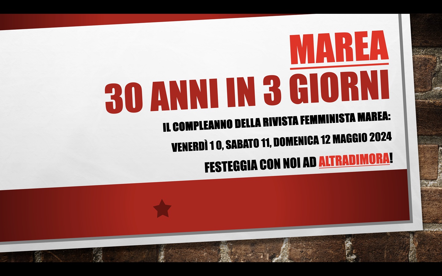 Marea 30 anni in 3 giorni Venerdì 10, sabato 11, domenica 12 maggio 2024 festeggia con noi ad altradimora! Caranzano, Strada Caranzano 72, Cassine (AL) Per i suoi trent’anni di vita la rivista femminista Marea invita tutte e tutti alla…