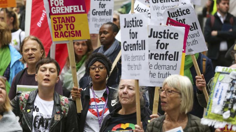 Degli attivisti mostrano cartelli durante la manifestazione di solidarietà per il gruppo Justice for Grenfell contro la mancanza di azione da parte del governo a seguito dell’incendio della Grenfell Tower nell’assegnazione di nuovi alloggi alle famiglie colpite dall’incidente, ritardi nell’inchiesta…