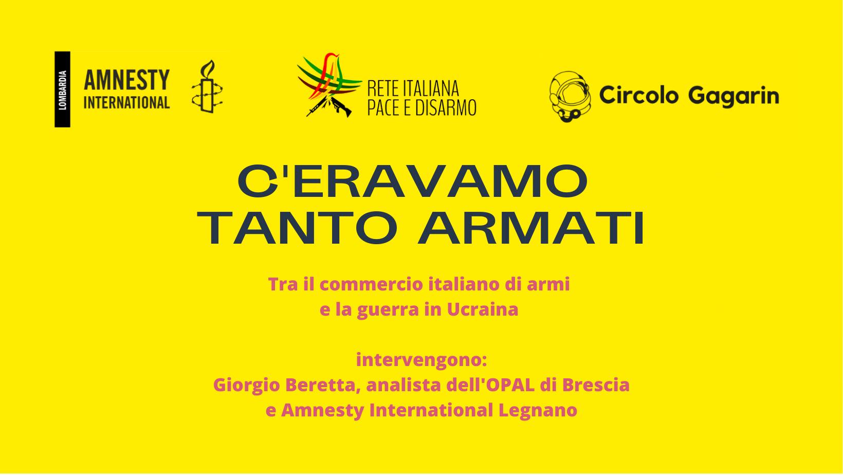 Venerdì 1° aprile 2022 h. 21:00 Circolo Gagarin, via Galvani 2 bis, Busto Arsizio Evento di Circolo Gagarin e Amnesty Legnano Ingresso gratuito riservato a socie e soci Arci Apertura h. 19:30 con bar, cucina e bookshop attivi “C’eravamo tanto armati”, un incontro…