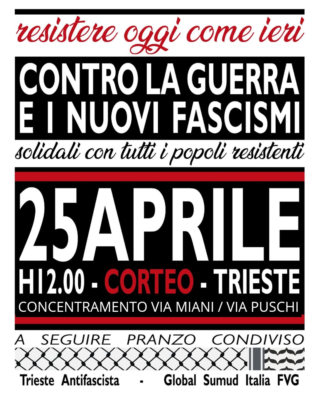 Il Coordinamento No Green Pass e Oltre parteciperà al corteo del 25 Aprile promosso da Trieste Antifascista e da Global Sumud Italia Fvg portando lo striscione NO ALLA TERZA GUERRA MONDIALE NO AL RIARMO. Qui sotto il testo di indizione…