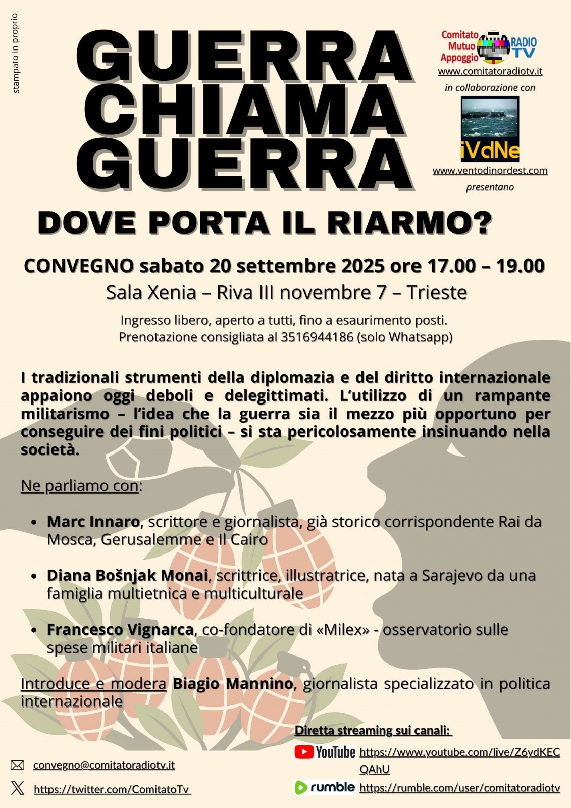 Sabato 20 settembre dalle ore 17 alle ore 19 presso la Sala Xenia di Riva III Novembre a Trieste si terrà il convegno “Guerra chiama guerra” Ne parliamo con: Marc Innaro , scrittore e giornalista, già storico corrispondente RAI da…