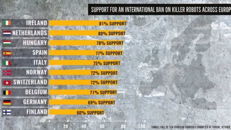 Il 73% dei cittadini di 10 Paesi europei vuole la messa al bando dei “killer robots”