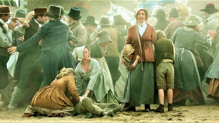 Peterloo, ovvero l’orrore del campo di battaglia dopo la carneficina di Waterloo, replicato nella piazza St Peter’s Field a Manchester il 16 agosto 1819. Circa 60000 manifestanti si riuniscono in quella piazza per urlare il proprio diritto a una vita…