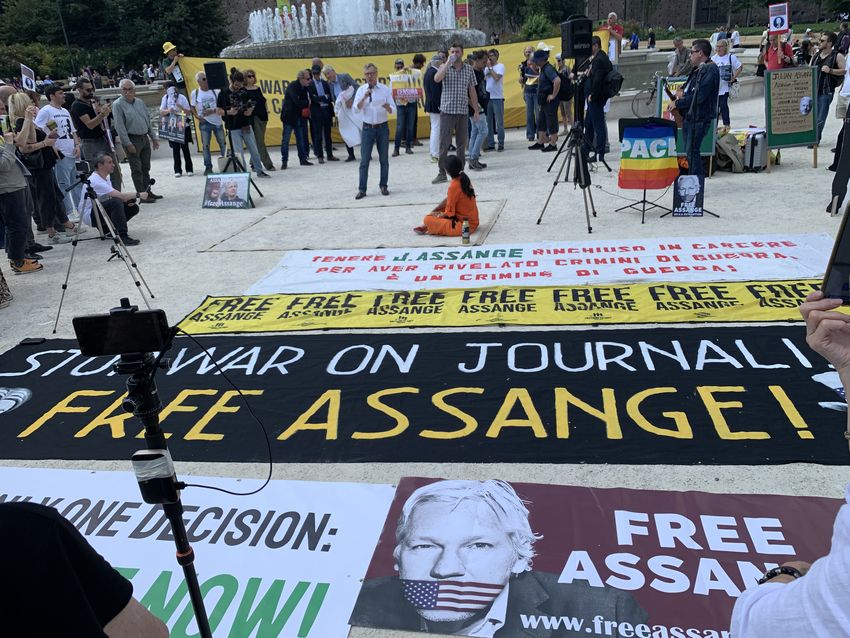 Stella Assange presente alla manifestazione a Milano in Piazza Castello per la libertà di Julian