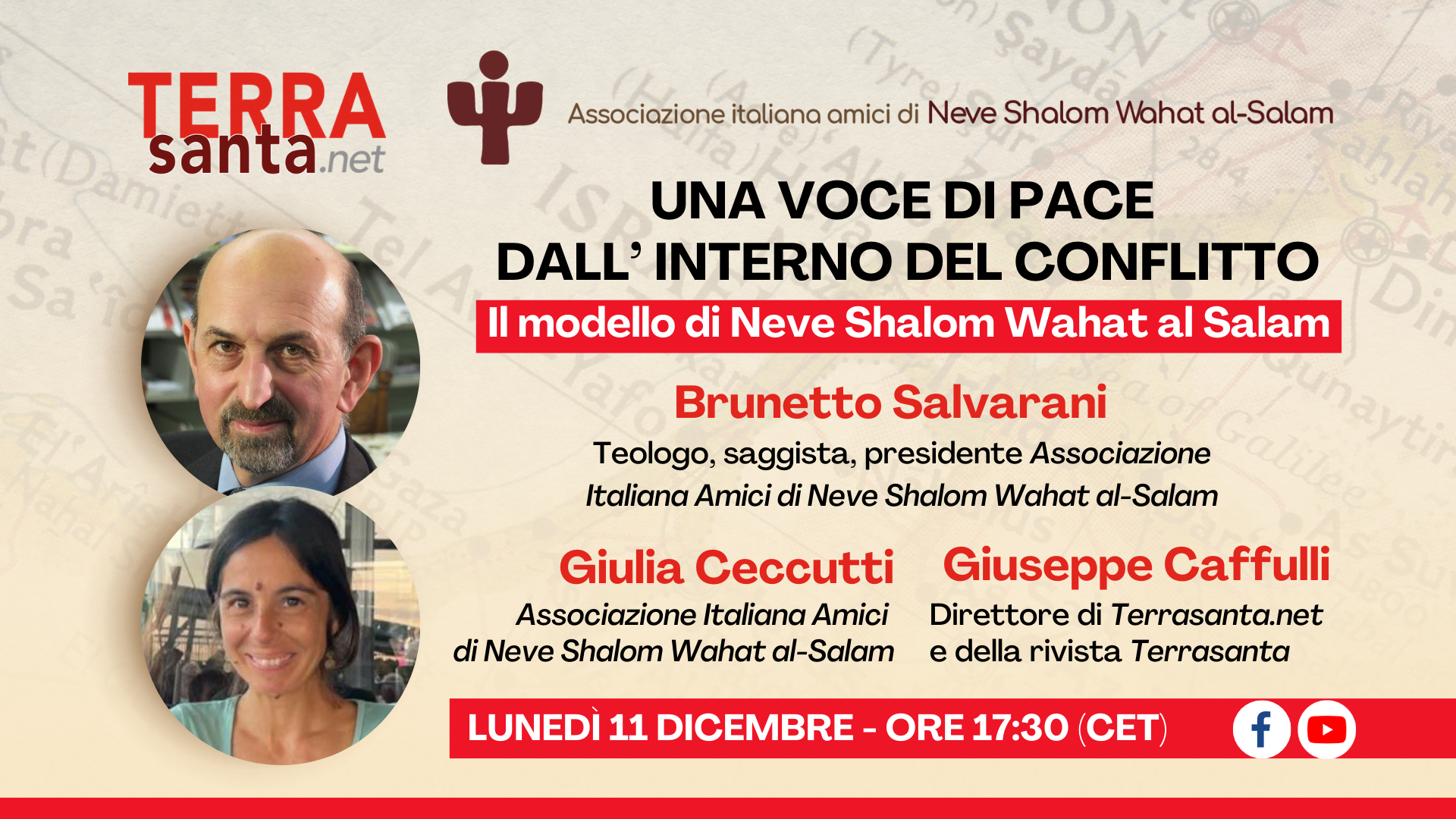 Lunedì 11 dicembre 2023, alle ore 17:30, invitiamo a seguire la diretta di Terrasanta.net con Brunetto Salvarani e Giulia Ceccutti, che parleranno dell’esperienza di Neve Shalom Wahat al Salam, villaggio cooperativo nel quale vivono insieme ebrei e palestinesi. La diretta…