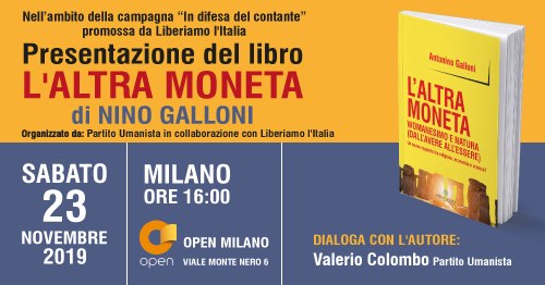 Sabato 23 novembre 2019 alle 16 Open Milano, viale Monte Nero 6, Milano Organizzato da Partito Umanista di Milano, Partito Umanista Italia, Open Milano, Liberiamo l’Italia Presentazione del libro “L’ALTRA MONETA” di Antonino Galloni Womanesimo e Natura ( dall’avere all’essere)…