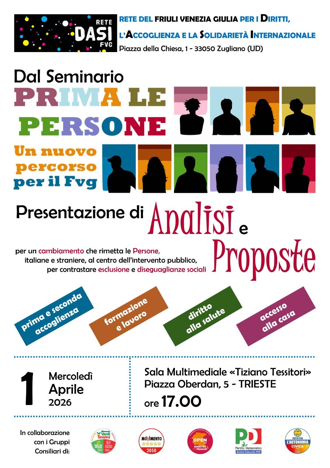 Mercoledì 1 aprile 2026, alle ore 17.00 presso la Sala Multimediale «Tiziano Tessitori» di Piazza Oberdan 5 a Trieste, la Rete DASI FVG — Rete del Friuli Venezia Giulia per i Diritti, l’Accoglienza e la Solidarietà Internazionale — presenta il…
