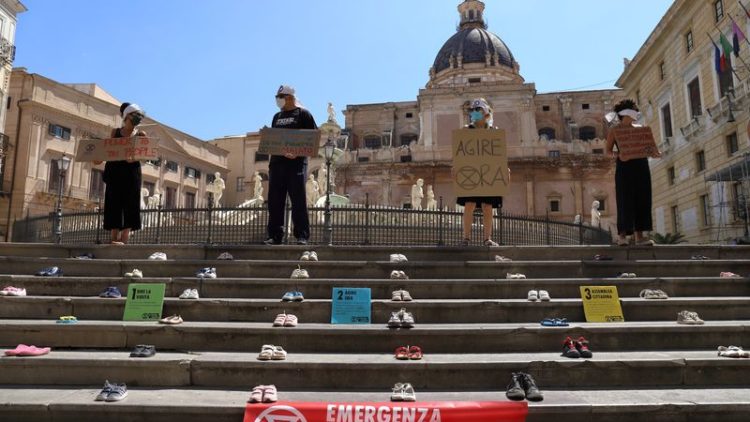 Un tappeto di scarpe da bambino a Palermo: Extinction Rebellion rivendica un pianeta sano per le nuove generazioni