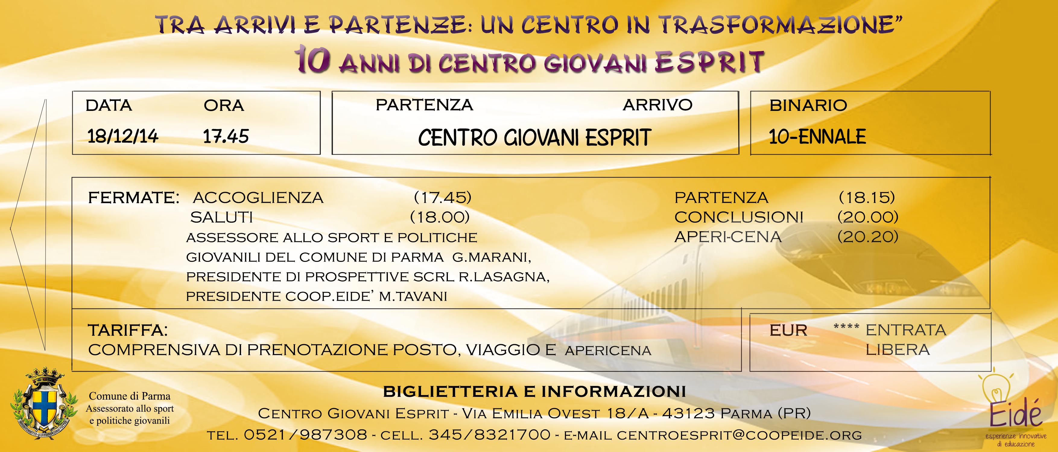 Fra arrivi e partenze, un centro in trasformazione. 10 anni di Centro Giovani Esprit.  Questo il titolo della celebrazione conviviale ma anche riflessiva proposta per festeggiare i dieci anni del Centro Giovani Esprit del Comune di Parma, gestito dalla cooperativa…