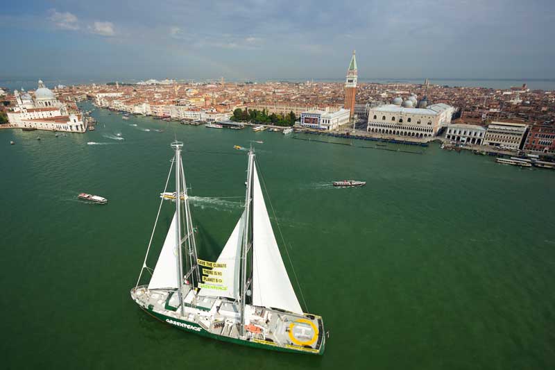 La Rainbow Warrior di Greenpeace a Venezia per denunciare i rischi dei cambiamenti climatici