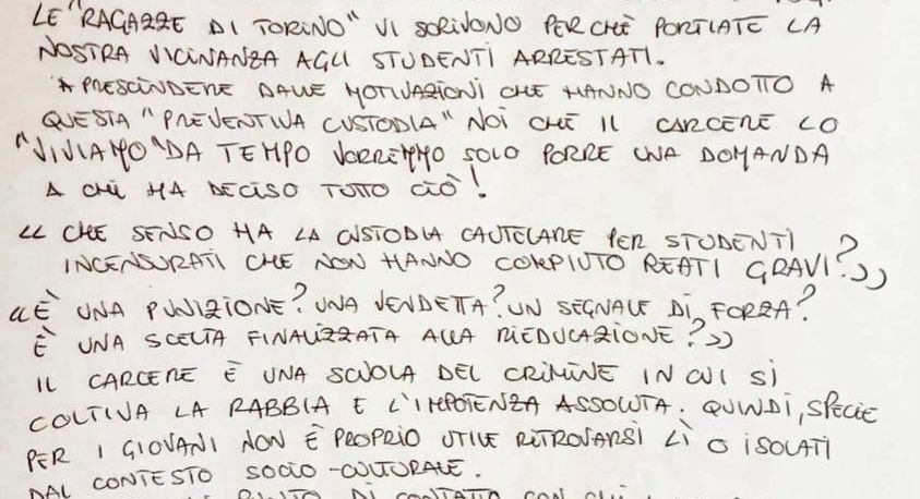 Solidarietà agli studenti dalla sezione femminile del Carcere delle Vallette: una lezione di umanità che giunge dalle carcerate di Torino in favore dei tre giovani studenti a cui sono state applicate durissime misure penali cautelari Sono Marina , scrivo questa…