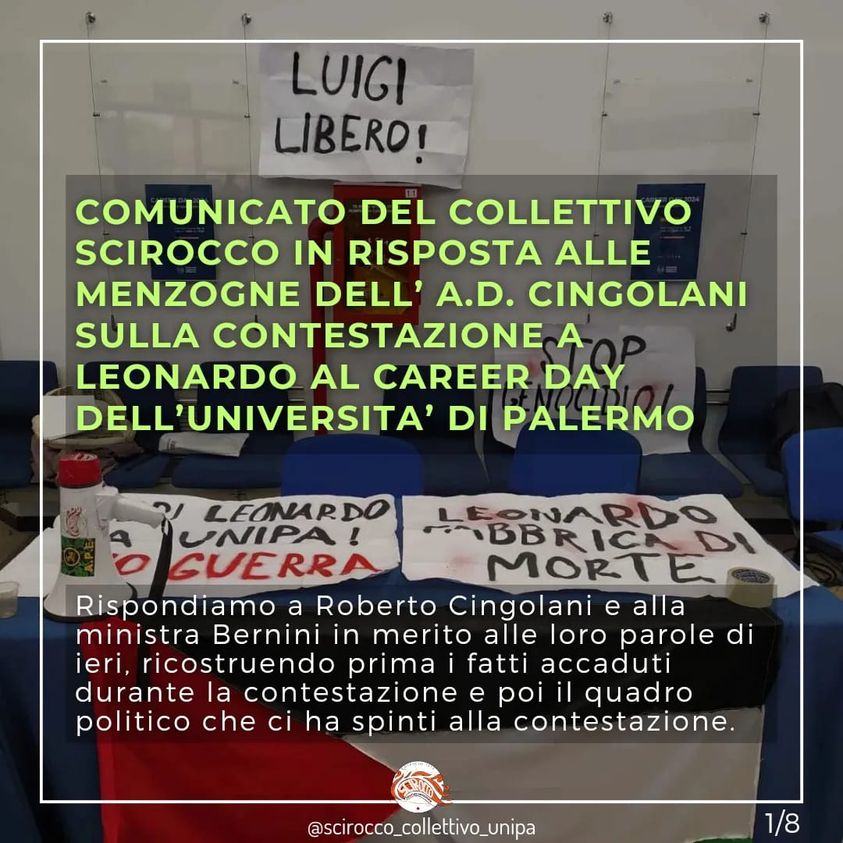 Riceviamo e volentieri diffondiamo COMUNICATO DEL COLLETTIVO SCIROCCO IN RISPOSTA ALLE MENZOGNE DELL’ A.D. CINGOLANI SULLA CONTESTAZIONE A LEONARDO AL CAREER DAY DELL’UNIVERSITA’ DI PALERMO Rispondiamo a Roberto Cingolani e alla ministra Bernini in merito alle loro parole di ieri,…
