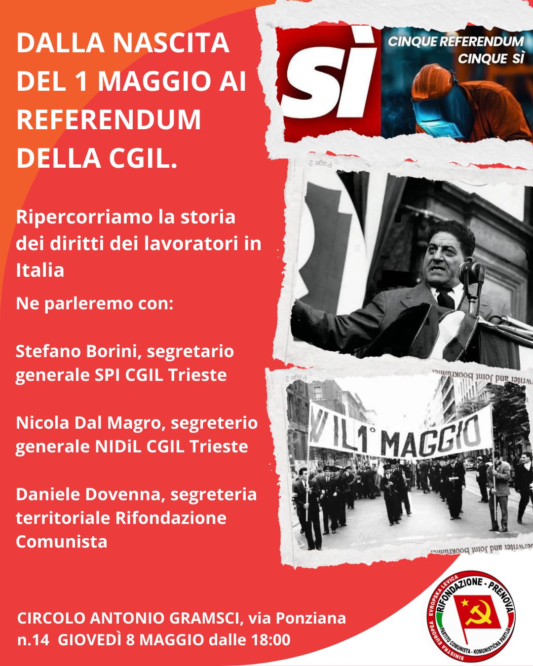 Giovedì 8 maggio alle ore 18.00 presso la Casa del Popolo “Antonio Gramsci”, via Ponziana 14 (Trieste) -1° piano, il Partito della Rifondazione Comunista-Sinistra Europea organizza l’incontro “Dalla nascita del 1° Maggio ai referendum della CGIL”. Partecipano Stefano Borini (segretario…