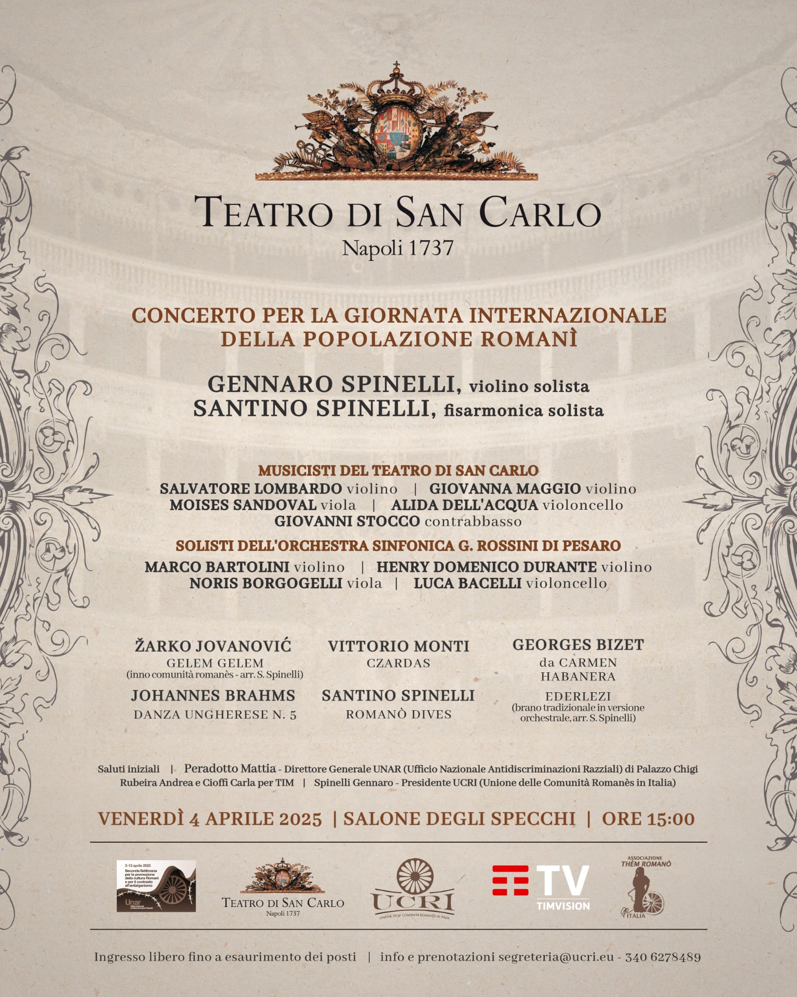 Riceviamo e pubblichiamo da Gennaro Spinelli, presidente nazionale UCRI- Unione Comunità Romanès Italia. Venerdì 4 aprile, alle ore 15:00, il Salone degli Specchi, Teatro San Carlo di Napoli, ospiterà un concerto per celebrare la Giornata Internazionale dei Rom e Sinti…