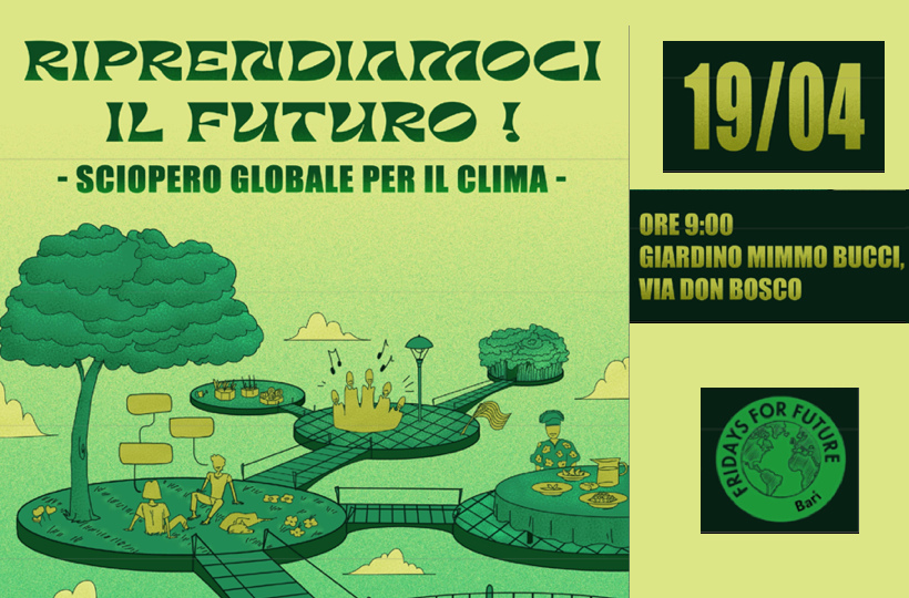 In occasione del 19 APRILE 2024, SCIOPERO GLOBALE PER IL CLIMA ecco l’elenco di tutte le iniziative: Bari: evento “Riprendiamoci il futuro!” @ Giardino Mimmo Bucci (tutto il giorno 9:30-21:30) Bergamo: 19 merenda sociale a tema ecologia con studentx (13.30…