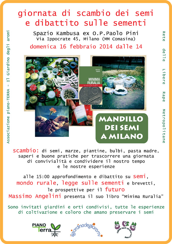 Domenica 16 febbraio 2014 dalle ore 14 alle ore 18. Spazio Kambusa (sopra il bar di Olinda) all’ex OP Paolo Pini,  Via Ippocrate 45, (MM Affori FN, uscita Via Ciccotti), Milano. Piano-TERRA , in collaborazione con il Giardino degli Aromi, e la Rete delle…