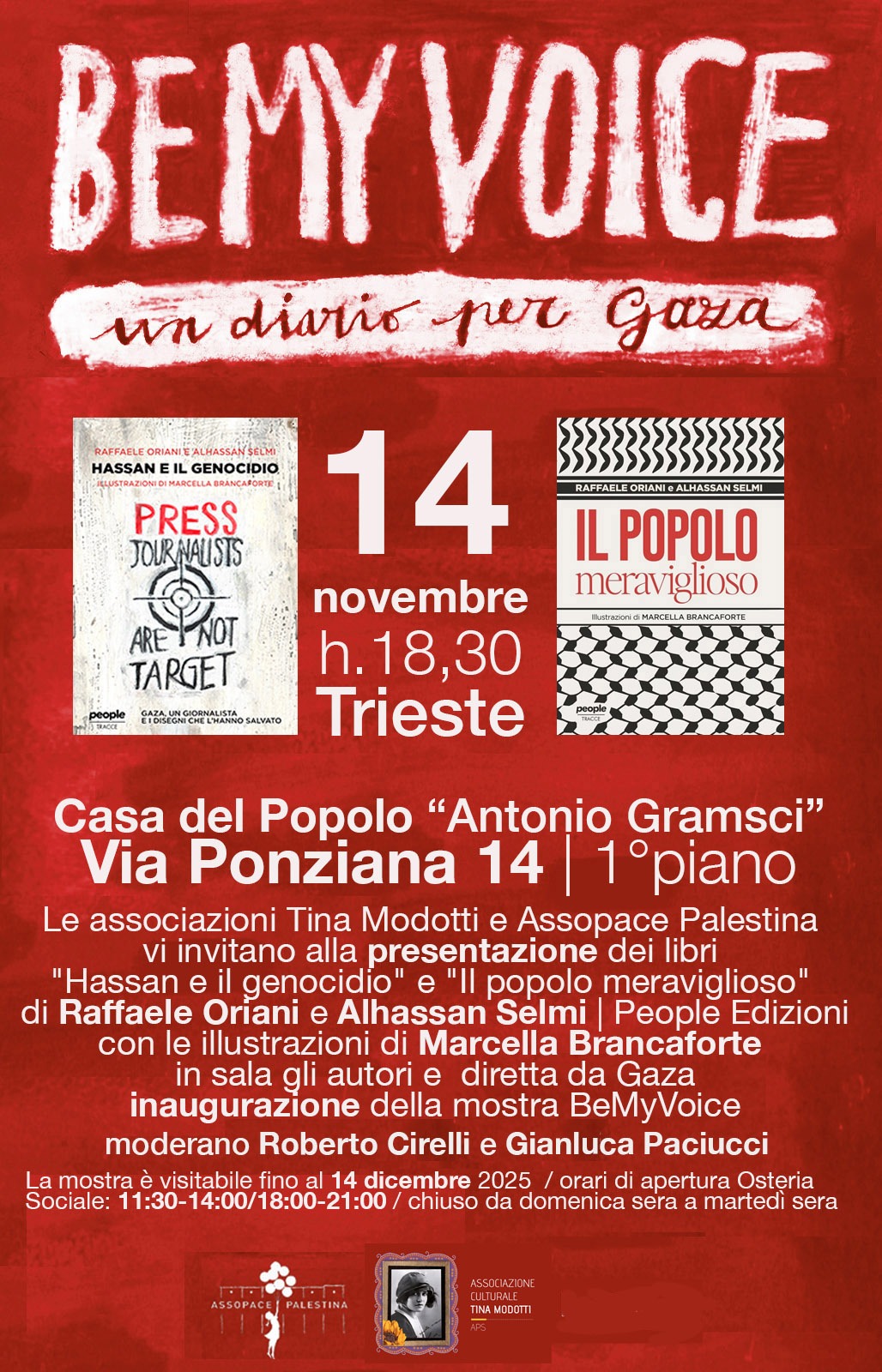 Venerdì 14 novembre alle ore 18.30 presso la Casa del popolo “A. Gramsci” (1° piano) l’Associazione culturale Tina Modotti aps e Assopace Palestina Trieste invitano alla presentazione dei libri Hassan e il genocidio e Il popolo meraviglioso di Raffaele Oriani…