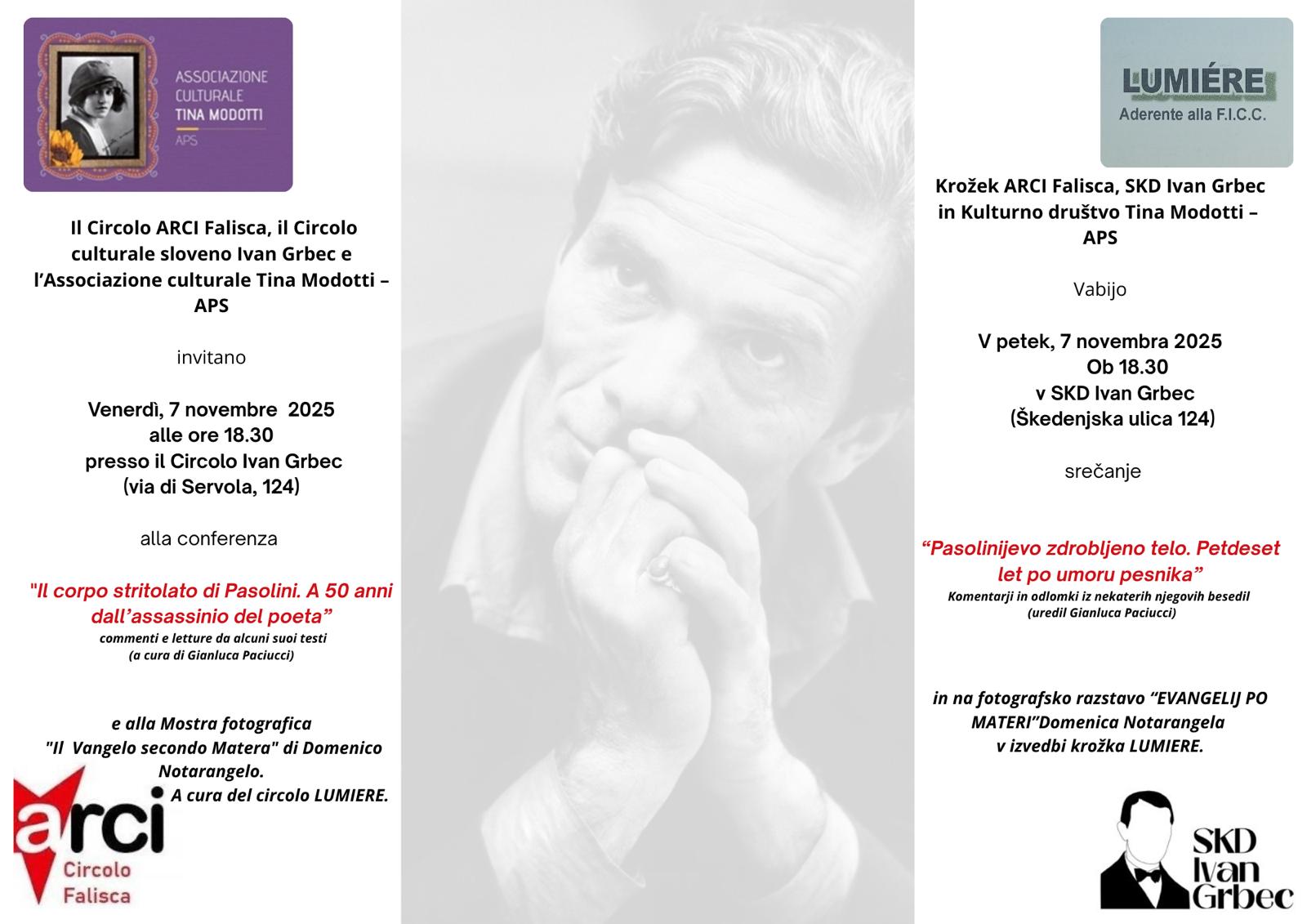 Venerdì 7 novembre alle ore 18.30 presso il Circolo Ivan Grbec, via di Servola 124  a Trieste si svolgerà l’incontro “Il corpo stritolato di Pasolini. A 50 anni dall’assassinio del poeta. Commenti e letture da alcuni suoi testi”, a cura…