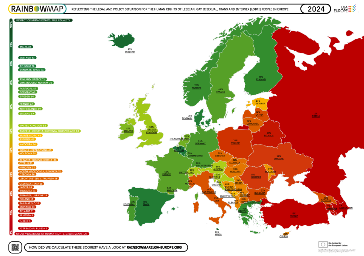 Italia al 36esimo posto su 48 paesi europei nell’indice di tutela dell’uguaglianza legislativa delle persone LGBTQIA+
