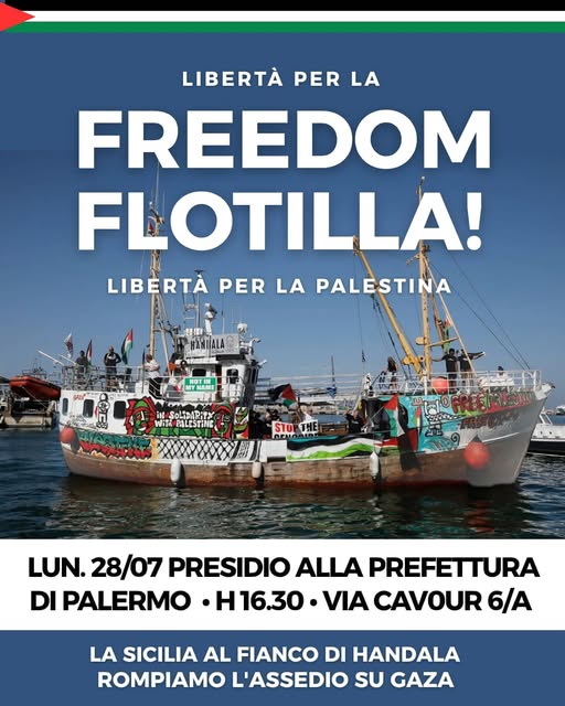 Le associazioni pacifiste, i movimenti antimilitaristi, gruppi e collettivi anticapitalisti siciliani si danno appuntamento domani pomeriggio davanti a tutte le prefetture siciliane in solidarietà con la nave Handala e il suo equipaggio e con tutto il popolo palestinese. Riportiamo qui…