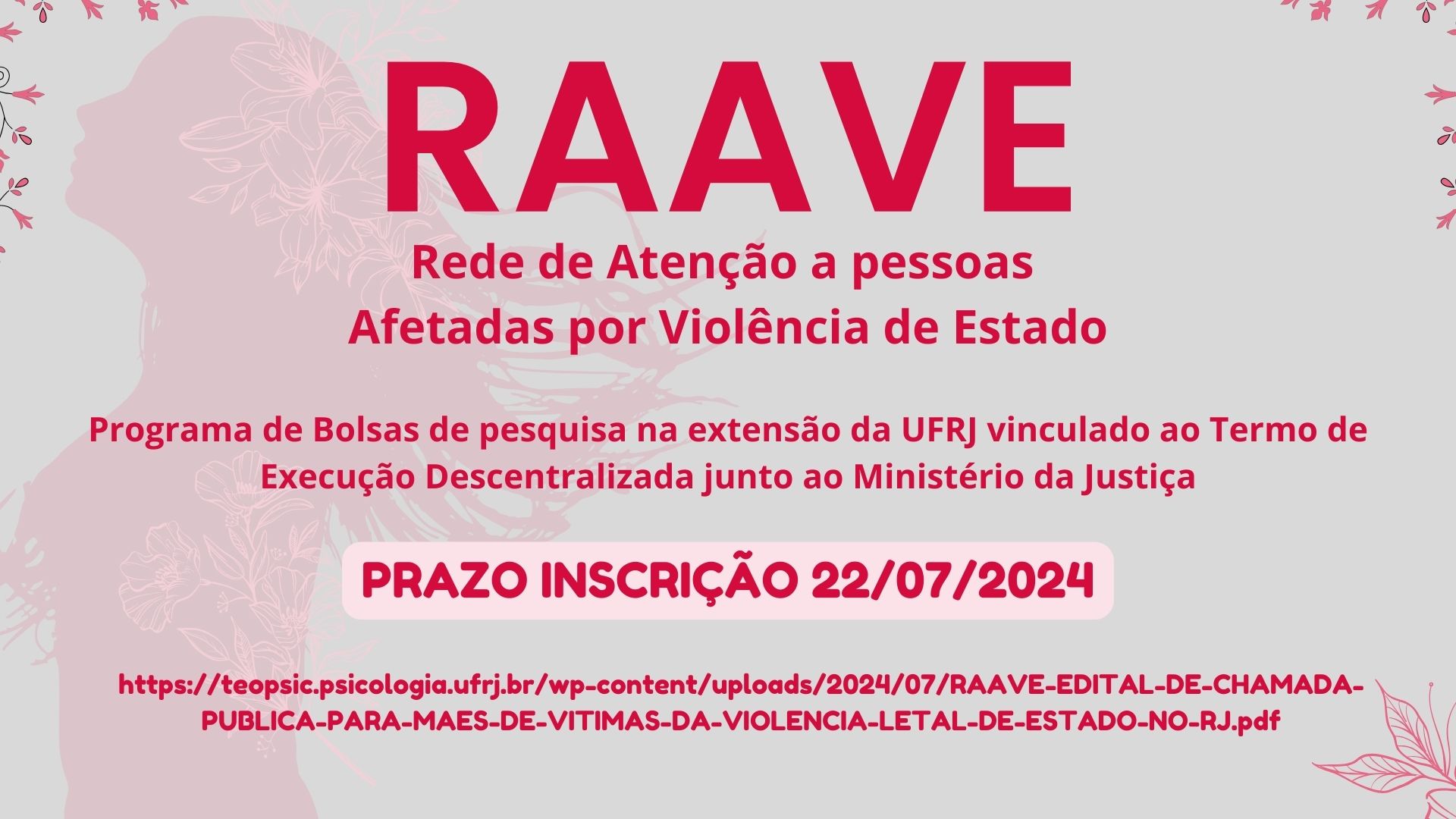 OPORTUNIDADE Programa de Bolsas de pesquisa na extensão da UFRJ vinculado ao Termo de Execução Descentralizada junto ao Ministério da Justiça voltado para a “Ampliação da Rede de Atenção a Pessoas Afetadas pela Violência de Estado (RAAVE)”: – Inscrições abertas…