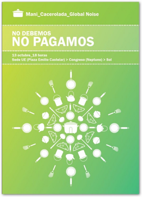 O próximo 13 de outubro, com o lema “Não devemos, não pagamos”, os indignados têm convocado uma manifestação/panelaço –Global Noise– em diferentes países para denunciar o estado ao que as populações estão sendo submetidas. No caso de Madri, a manifestação terá lugar às 18 horas e sairá da sede da UE na capital espanhola para terminar em Sol, passando pelo Congresso dos Deputados.
