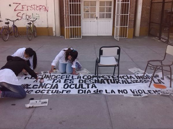 Pescio: Até aqui pretendemos nessa nota comunicar o nível de desenvolvimento do processo de 4 anos em uma cidade e mostrar paralelamente como cresce e se organiza a rede. Para apreciar por comparação com momentos anteriores as mudanças progressivas em um lugar especifico, contamos com essa entrevista realizada ha dois anos pela TV local com integrantes da Escola 70, instituição onde em 2011 se iniciou a construção de “Vila Regina não violenta”.