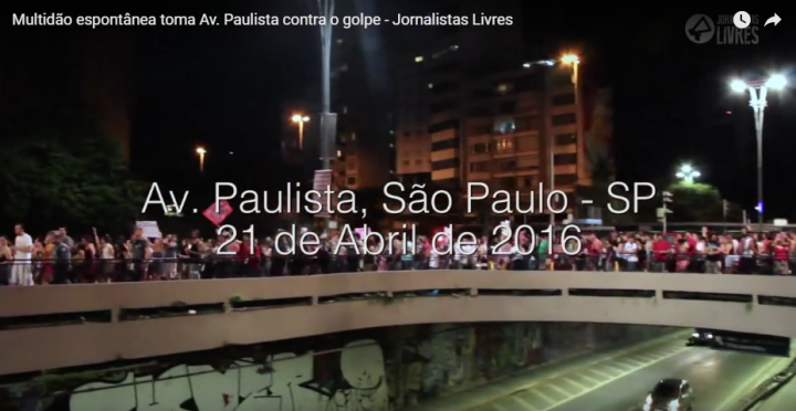 Na noite do feriado de Tiradentes, 21 de Abril, um evento do Facebook criado quase como uma brincadeira acabou chamando milhares de pessoas para a Av. Paulista para protestar contra o golpe que está tramitando em Brasília sob a alcunha de impeachment. Diferente dos outros atos do campo democrático, este não foi coordenado por movimentos sociais organizados, sindicatos ou partidos políticos – muita gente, inclusive, participou de um ato contra o golpe pela primeira vez.