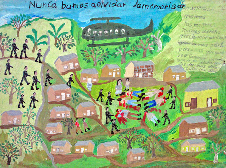 Infelizmente, esse incidente é apenas um dos muitos massacres que já aconteceram em San José de Apartadó nos últimos anos. A poucos metros do portão de entrada da comunidade, é possível ver um monte de nomes pintados em diferentes cores. É o Monumento de la Memória, que homenageia todas as pessoas assassinadas até hoje, seja por grupos paramilitares, guerrilheiros ou pelo próprio Exército.