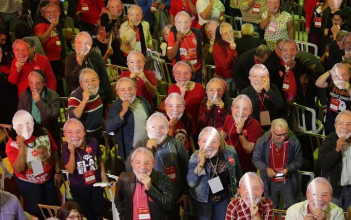 Delegados usam máscara de Lula, em cumprimento simbólico ao desejo expresso pelo ex-presidente: ‘Somos milhões de Lula. Foto: Twitter/Gleisi Hoffmann/RBA