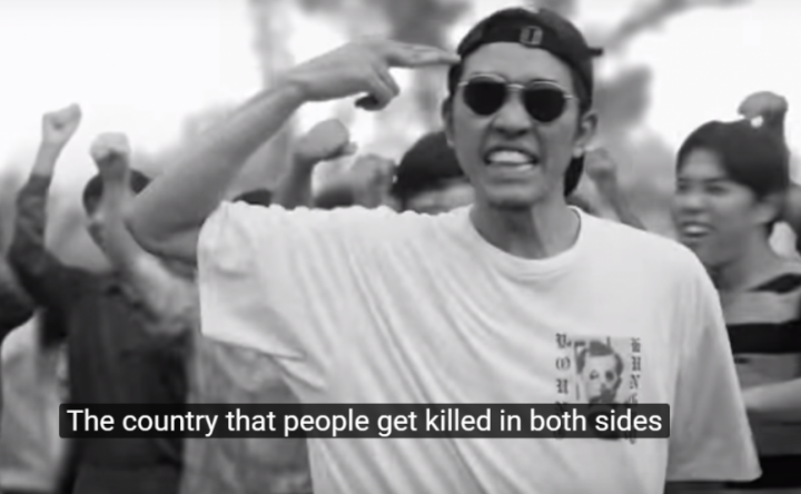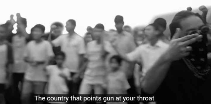 “O país que aponta a arma para a sua garganta”. O trecho se refere ao golpe militar de 2014 e à continuidade da ditadura militar na Tailândia. Captura de tela do vídeo no YouTube.